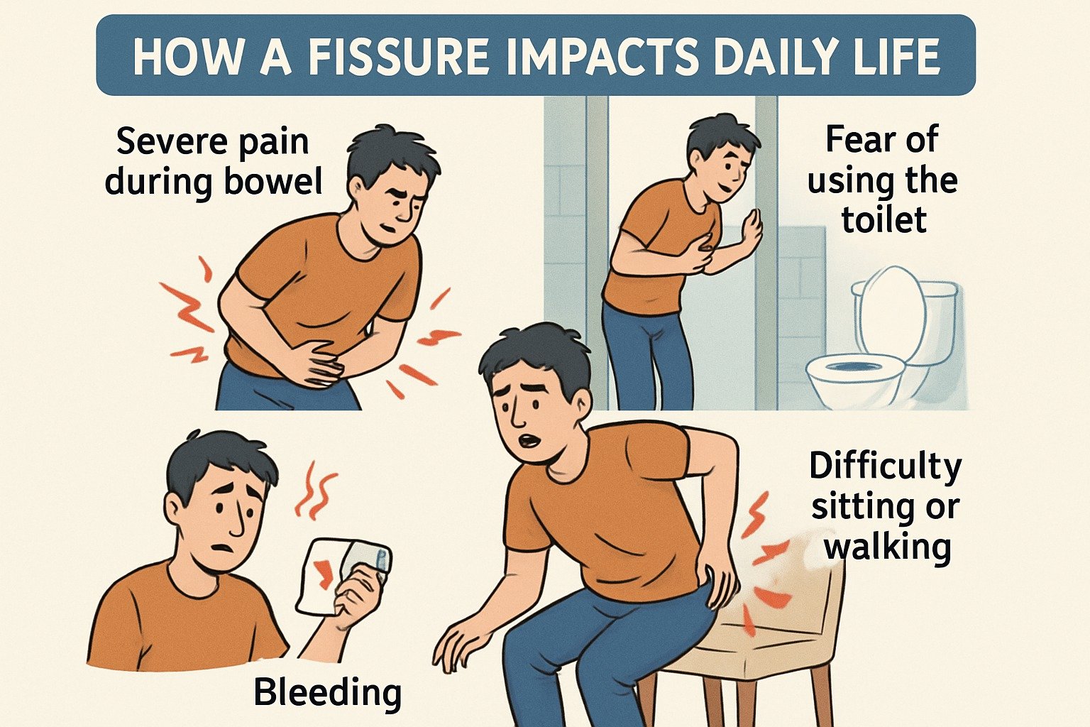 The physical discomfort caused by a fissure slowly affects emotional health, work efficiency, and social life: